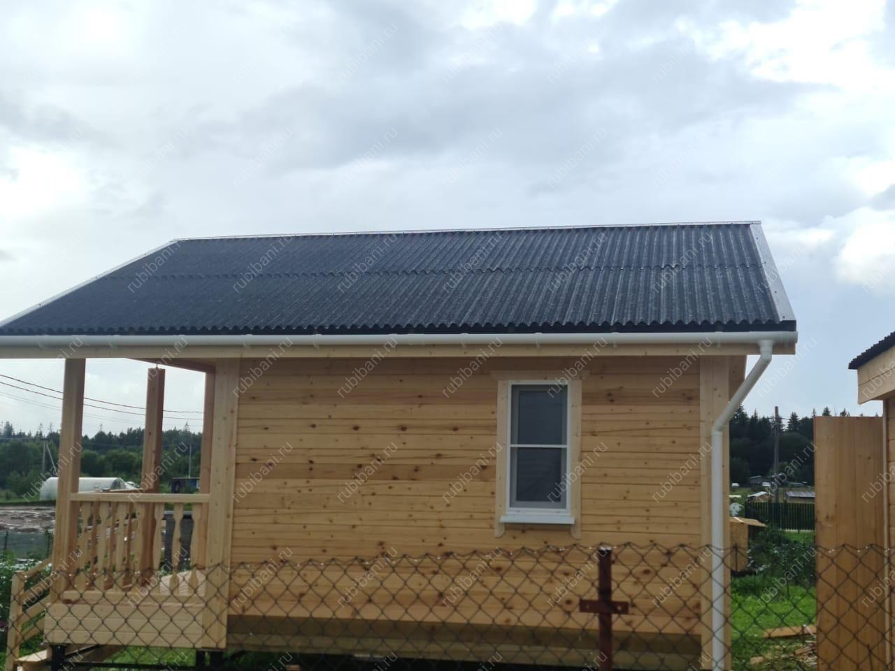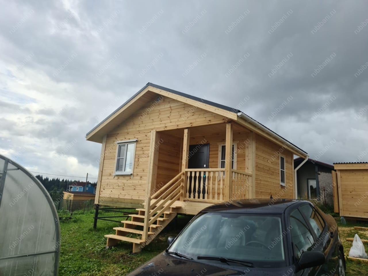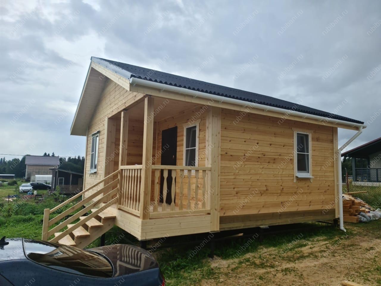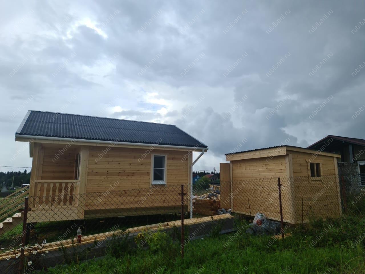 Конструкция бани и веранды выполнена из профилированного бруса, обеспечивающего отличную теплоизоляцию и долговечность. Компактная веранда существенно расширяет полезную площадь, создавая плавный переход между интерьером бани и окружающей природой, не нарушая гармонии участка.